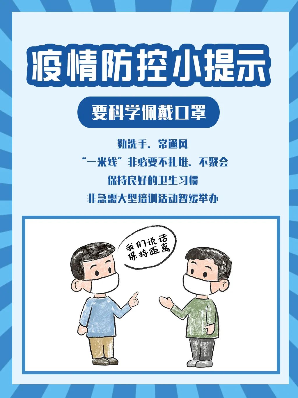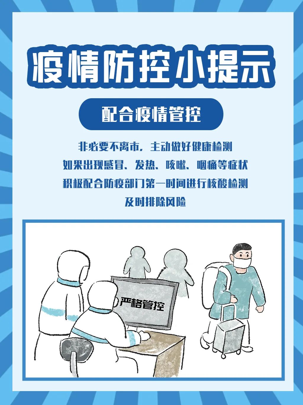 请广大群众自觉遵守疫情防控相关规定,不信谣、不传谣、不造谣,及时关注官方发布的权威信息。时刻保持个人防护意识,戴口罩,勤洗手,常通风,少聚集,用公筷,保持安全社交距离。如出现发热、咳嗽等症状,佩戴好一次性医用外科口罩,及时到就近的发热门诊就诊,就诊过程中,避免乘坐公共交通工具。