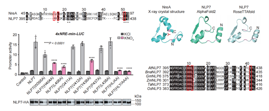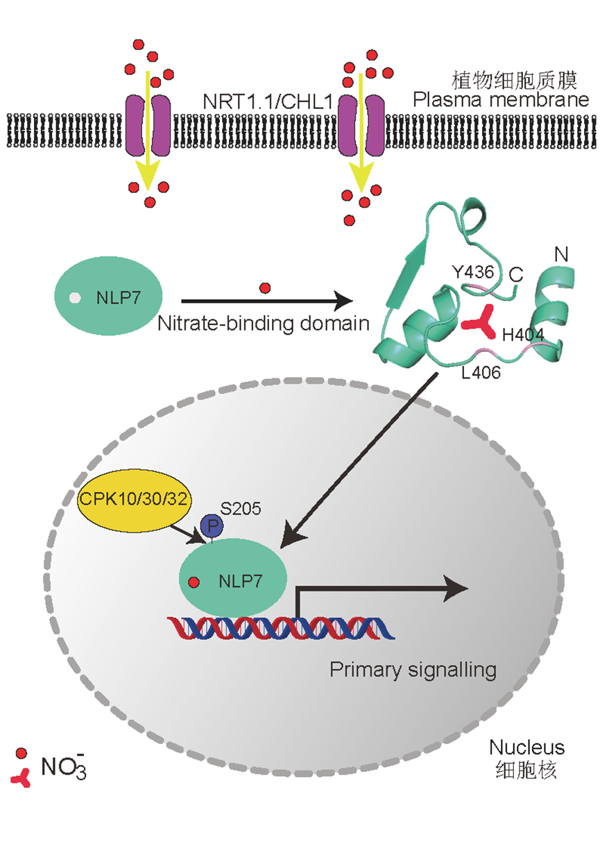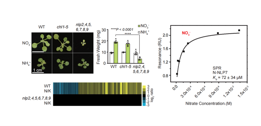 研究表明,NLP家族的NLP2/4/5/6/7/8/9作为转录因子起始了硝酸盐诱导的转录重塑和物质运输、代谢、激素信号转导和根系及地上部分的生长等发育进程。通过新型的分子互作检测方法证实了硝酸盐可以和NLP7蛋白直接互作。设计实验将黄色荧光蛋白—柠檬黄切成两半分别接在NLP7蛋白的两端,可以构成一个荧光硝酸盐感受器,借助它可以用肉眼实现对植物细胞水平的硝酸盐动态观察分析。