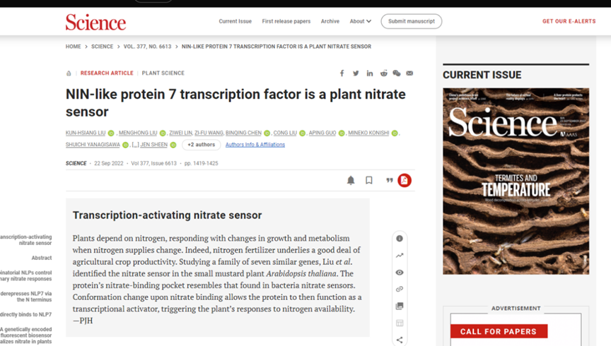 9月23日,西北农林科技大学刘坤祥教授领衔的植物氮素营养团队的研究成果《NLP7转录因子是植物的一个硝酸盐受体》在《科学》在线发表。