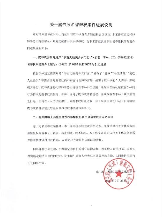 9月23日,虞书欣工作室发布关于虞书欣名誉维权案件进展说明。说明显示,被告、微博用户“宇宙无敌美少女门面_”发表“老赖”“私生活乱”“爱吃人血馒头”等诸多针对虞书欣的不实言论及侮辱言辞,侵犯其名誉权,法院判令该用户于判决生效起十日内在《人民法院报》上向虞书欣赔礼道歉,并赔偿精神损害抚慰金及维权成本共计39000元。