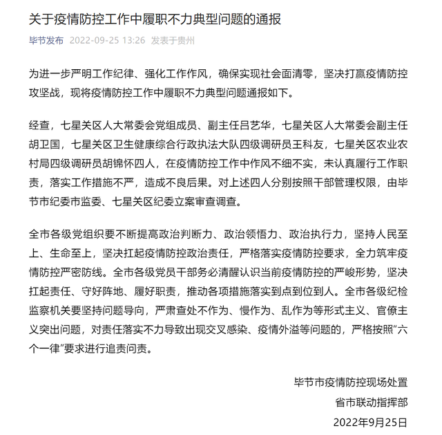 9月25日,毕节发布《关于疫情防控工作中履职不力典型问题的通报》:为进一步严明工作纪律、强化工作作风,确保实现社会面清零,坚决打赢疫情防控攻坚战,现将疫情防控工作中履职不力典型问题通报如下。