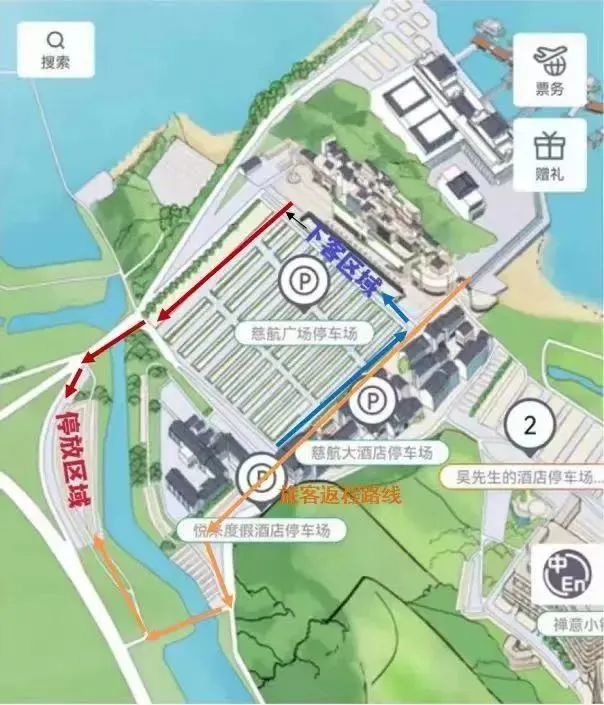 二、返程的中大型车辆旅客请按下图所示橙色线路自行返回车内。