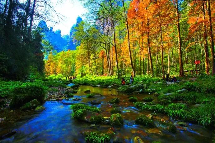 秋天的张家界,湛蓝的天空、七彩的秋叶,仿佛在这个童话般的世界。
