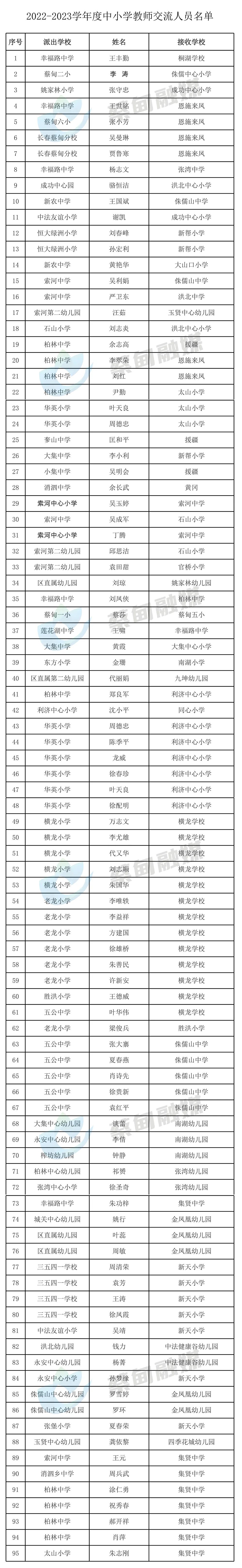 根据《区教育局关于推进中小学教师区管校聘改革做好2022-2023学年度教师交流工作的通知》精神,蔡甸区2022-2023学年度共有95名教师参加交流轮岗,现对2022-2023学年度中小学教师交流情况进行公示(表格附后)。公示时间2022年9月20日--2022年9月25日。