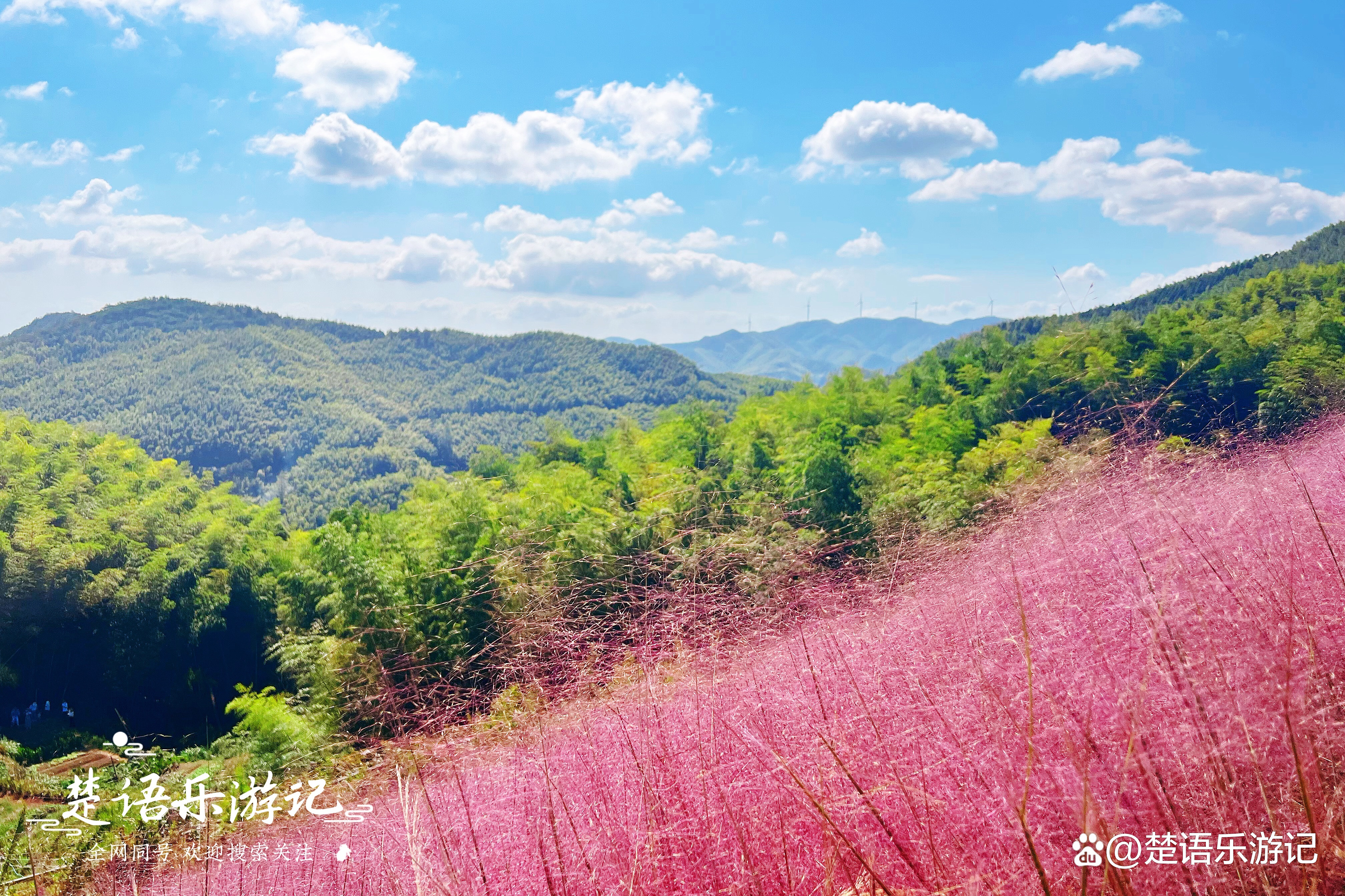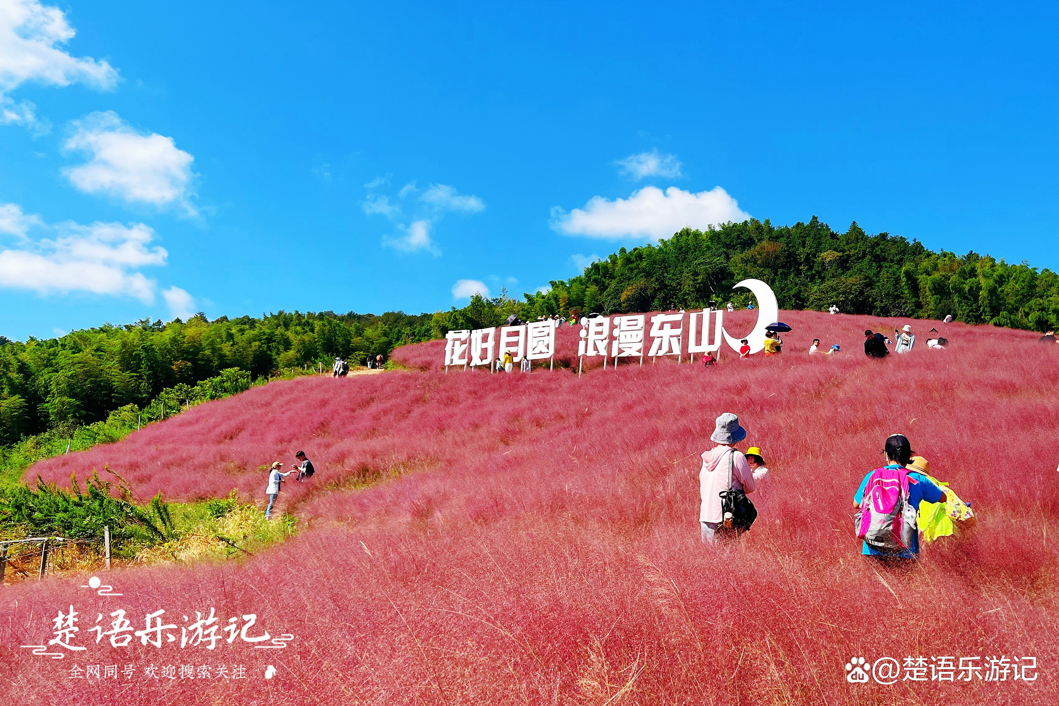 月宫山坐落在东山村的西南面,与西面的金山顶望海亭遥遥相望。月宫山顶地势平坦,周围山势起伏,峰谷相间。粉黛乱子草正好就栽种在月宫山顶所在的山坡上,花开时漫山红遍,而周边是连绵的青山或幽深的山谷,看粉乱花海美如童话世界,观周围群山壮如绿海烟波。置身其间令人心旷神怡,而且拍照十分出片,所以深受小姐姐的喜爱。