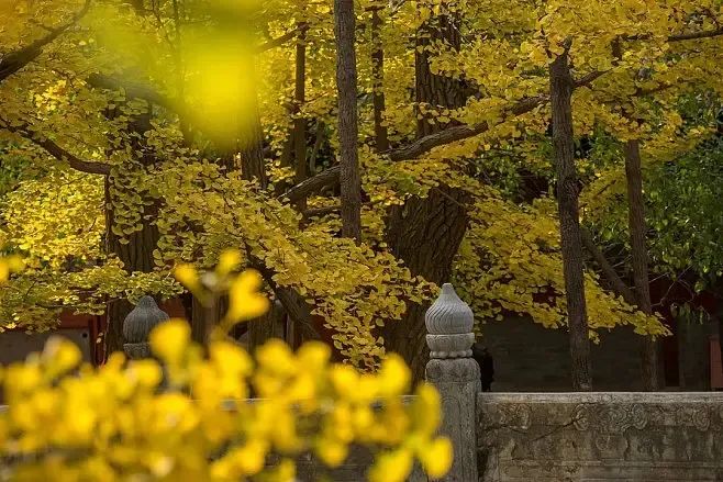 大觉寺地处群山环抱之中,林茂泉清,景色幽美,古柏参天,翠竹葱郁。“无量寿佛殿前辽代栽植的古银杏被称为‘银杏之王’,每年秋季,金黄的银杏叶与幽静的古寺相映成趣,自成一景,非常漂亮。”市民张女士介绍说。