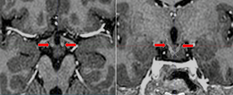 下丘脑错构瘤对于瘤蒂的处理非常关键,处理好瘤蒂才能保证术后的效果。患者三维的头部核磁共振发现病变形态特殊,仅有两个很细的瘤蒂从两侧与脑组织相连,瘤蒂直径最细的地方约1mm,最粗的地方也不超过2mm;如何将直径为0.8mm的电极精准的穿过瘤蒂,成为手术的主要难点,如果有任何哪怕0.5mm的偏差就有可能使电极位置偏移而监测不到异常的放电也无法通过毁损起到彻底阻断放电传导的效果。手术计划最终设计了两根电极,分别沿两侧的瘤蒂长轴穿过,保证对瘤蒂的彻底处理。在成功“消灭”了患者颅内的错构瘤后,将电极安全取出,既保障癫痫灶毁损、又保护了手术的安全性,解决了小文多年癫痫发作的问题。