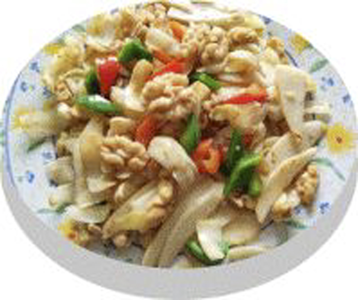 (3)热油起锅,下生姜、大蒜爆香,加入淮山、核桃翻炒片刻,再放入鲜百合、青、红辣椒炒熟,放适量白砂糖、食盐调味即可。