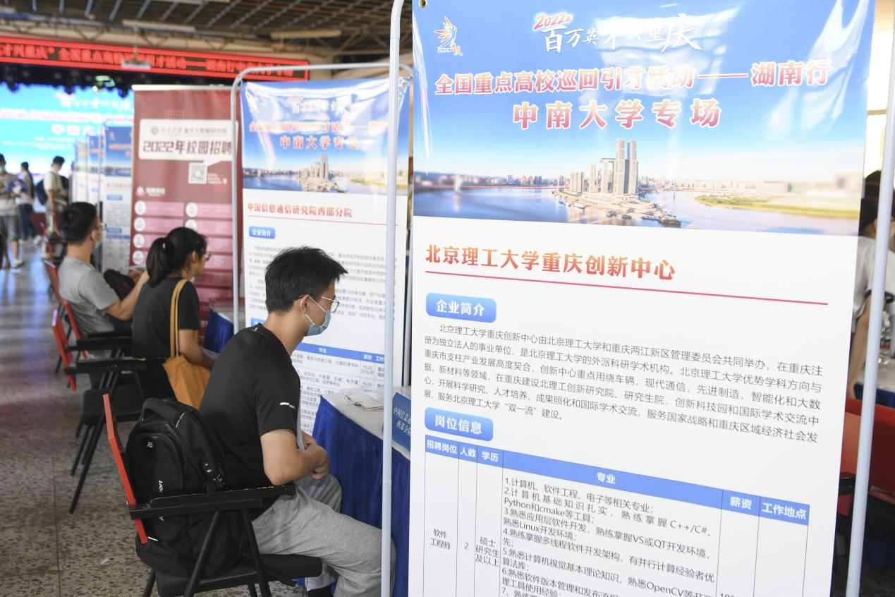 从四川到中南大学求学的陈鑫,学的是药学专业,他表示很愿意来重庆工作。近年来,重庆出台高层次人才、产业人才、“塔基”“塔尖”等一系列人才政策,鼓励优秀人才及其团队来渝创新创业,并分别给予相应的配套奖励。让他对重庆更是满怀期待。此次引才活动也吸引了众多西南地区生源的学生,他们感叹优质岗位众多,看到家乡就业前景良好,乐意回渝发展。2天时间内,参会单位共收到简历667份,有364人与用人单位达成了初步意向,其中博士23人,硕士198人,本科143人。
