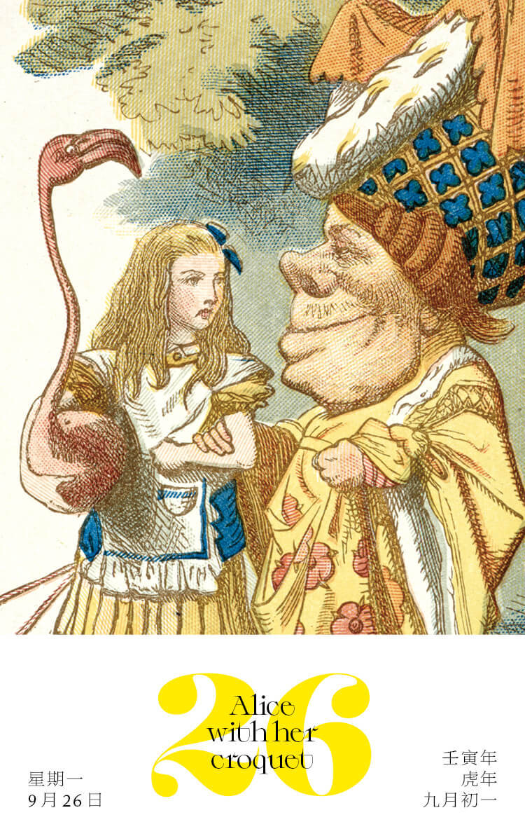 这幅插图出自1890年出版的《幼年爱丽丝》,图中,与怀抱火烈鸟球杆的爱丽丝站在一起的,是第六章“猪娃和胡椒”里的公爵夫人。