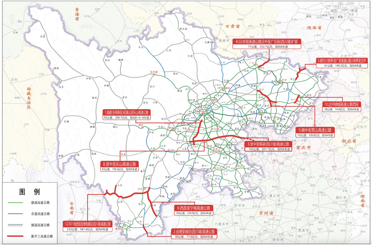 按照《四川省高速公路网布局规划(2022-2035年)》,我省高速公路规划总里程约2万公里,目前已建成通车8727公里,居全国第三。在建31个项目、3090公里。“十四五”期间,我省规划建成高速公路3000公里,计划完成投资4250亿元。到2025年,全省高速公路通车总里程将超过1.1万公里,出川通道达到37个,覆盖县达到152个。