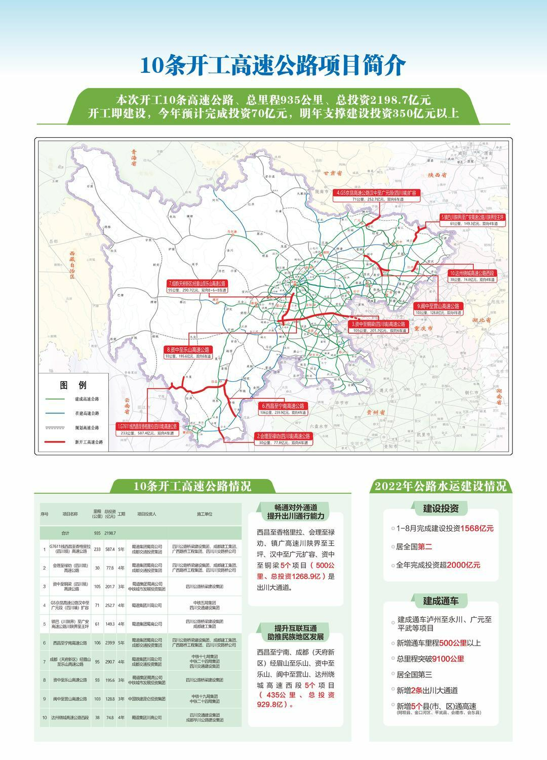 9月26日上午,四川省2022年第三季度重大项目现场推进活动在成都举行。其中,高速公路开工项目10个、总里程达935公里、总投资2198.7亿元,集中开工高速公路项目数量、投资额度均创四川交通历次开工之最。