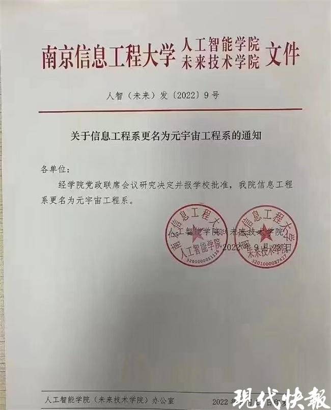 网传文件显示,9月23日,人工智能学院(未来技术学院)印发《关于信息工程系更名为元宇宙系的通知》(以下简称“通知”),通知显示,经学院党政联席会议研究决定并报学校批准,该院信息工程系更名为元宇宙工程系。