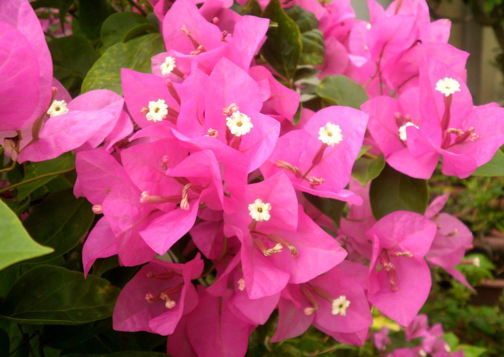 3、三角梅:三角梅是喜阳性的花卉,一年四季都要给它充足的晒太阳。开花相当壮丽,色彩丰富又鲜艳,红色的喜庆、黄色的热烈。不仅能做成盆栽盆景还能地栽让它攀爬,一颗三角梅就能爬满一座墙。三角梅开起花来只见花不见叶,又被称为叶子花,它的开花量相当大。有的三角梅一年四季不停地开花,夏天越热开得越火热,所以家里养盆三角梅!