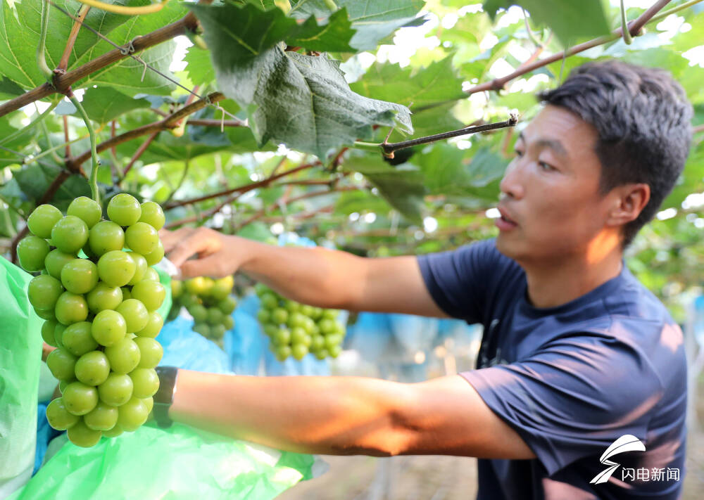 图为在青岛西海岸新区大场镇,农民在察看葡萄长势。