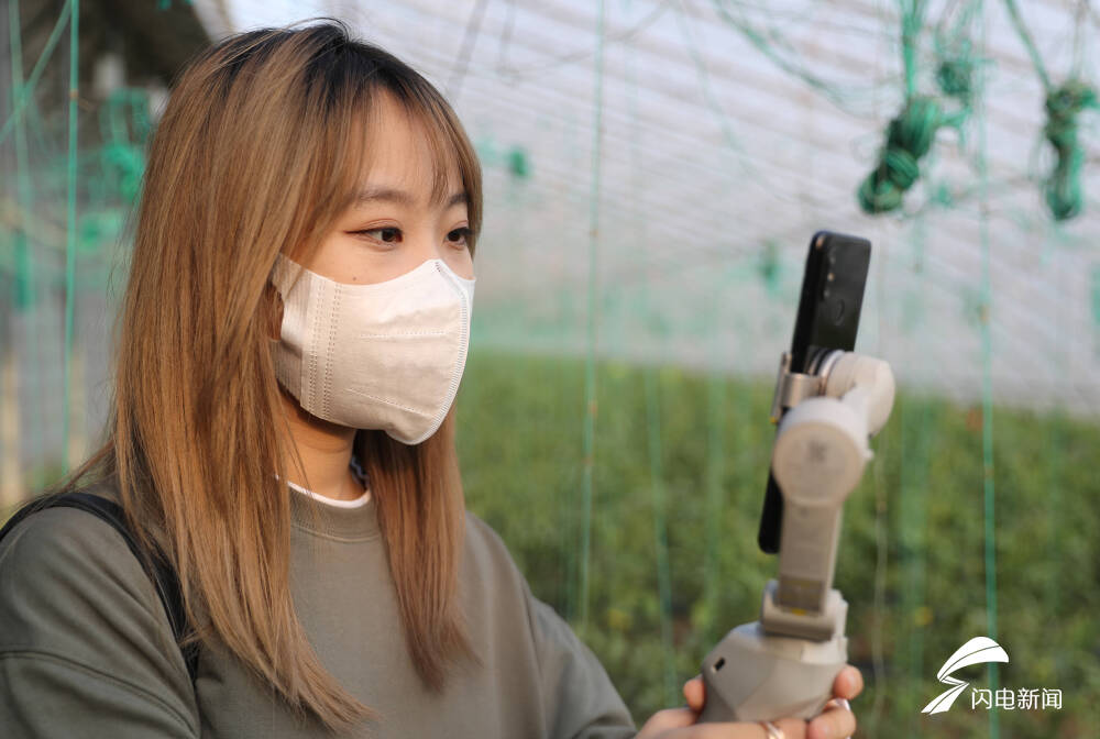 图为在青岛西海岸新区大场镇,“网红”在黄瓜地里进行直播。