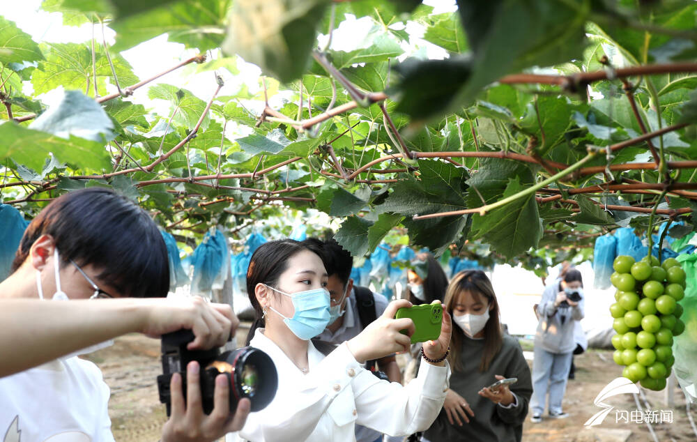 图为在青岛西海岸新区大场镇,市民在葡萄架下拍照留念。