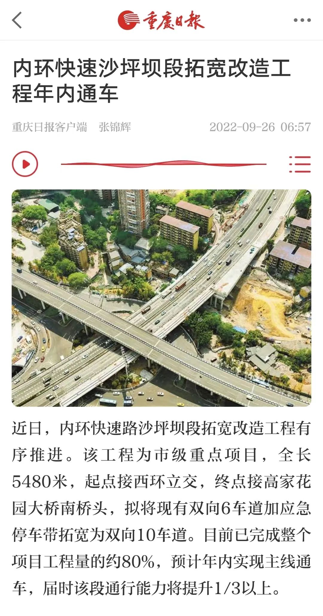 近日,内环快速路沙坪坝段拓宽改造工程有序推进。该工程为市级重点项目,全长5480米,起点接西环立交,终点接高家花园大桥南桥头,拟将现有双向6车道加应急停车带拓宽为双向10车道。目前已完成整个项目工程量的约80%,预计年内实现主线通车,届时该段通行能力将提升1/3以上。