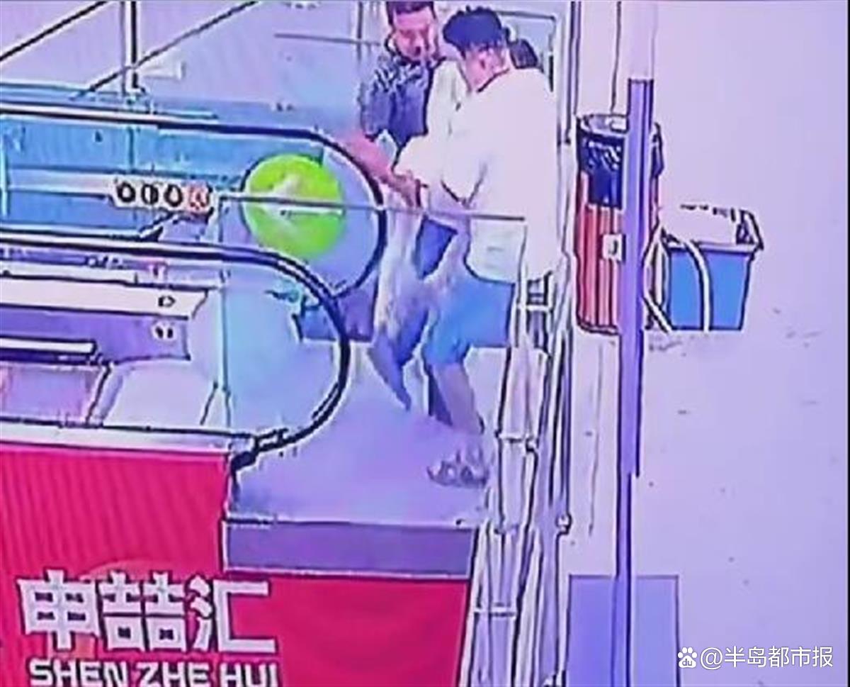 监控视频显示,一名女童双手扒在扶梯扶手处,随着扶梯上升,双腿悬空。之后被卡到扶梯与一面玻璃的夹缝处,情况十分危急。这时,两名男子见状,一同上前将女童解救下来。