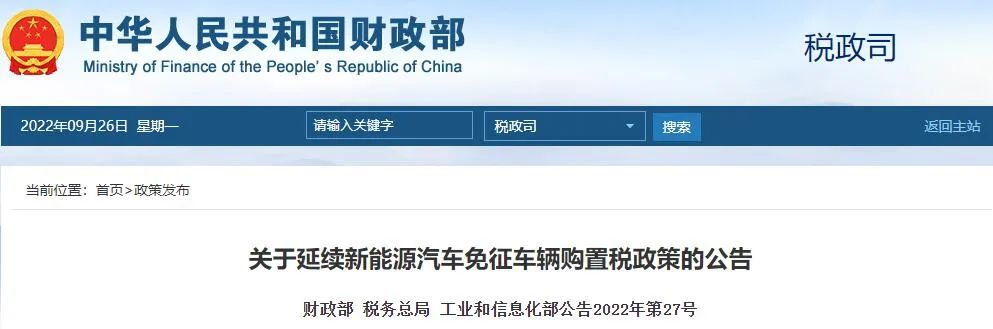 9月26日,财政部、税务总局、工业和信息化部发布关于延续新能源汽车免征车辆购置税政策的公告。