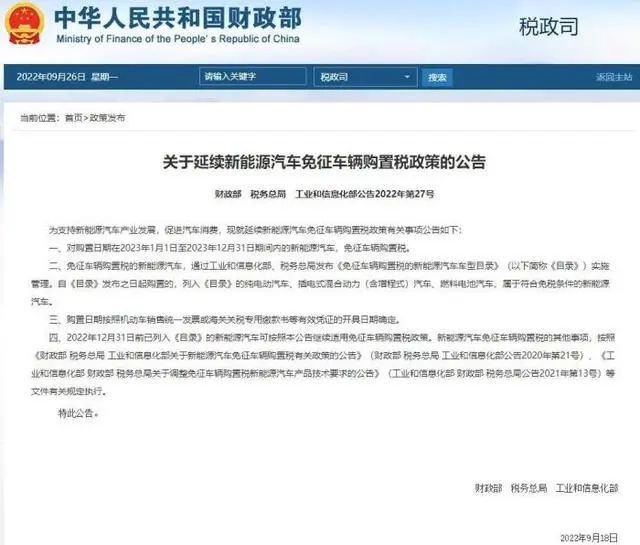 据财政部网站9月26日消息,财政部、税务总局、工业和信息化部发布关于延续新能源汽车免征车辆购置税政策的公告。