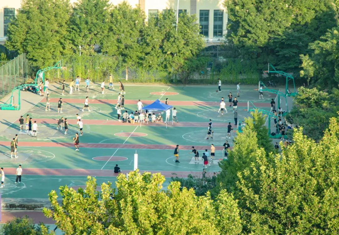 篮球场掩映于绿荫青葱
