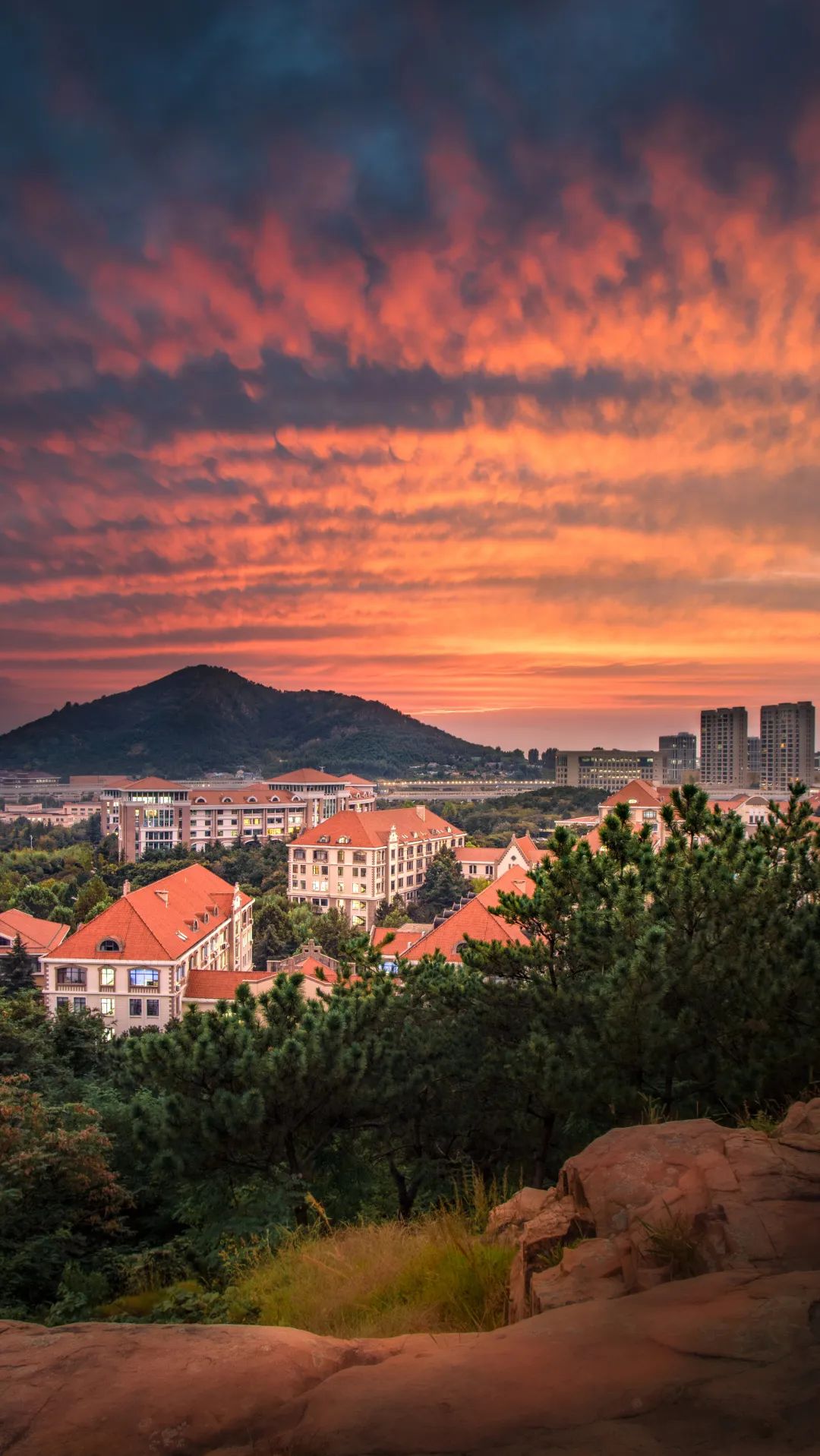 那万道霞光透过云隙照耀着海大园