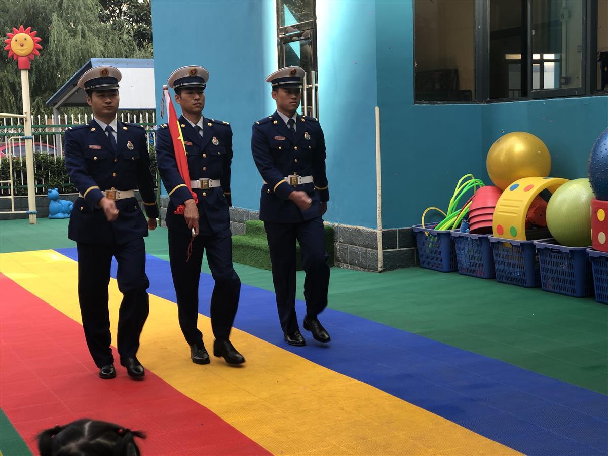 升旗仪式开始,消防员们昂首挺胸,迈着整齐、有力的步伐,扛着鲜艳的国旗,走向升旗台。随着《义勇军进行曲》奏响,鲜艳的五星红旗在国歌中冉冉升起。红旗在朝阳的映照下,显得格外鲜艳,格外美丽。幼儿园小朋友们的眼睛就紧紧地盯着消防员叔叔,那整齐的步伐、庄严的神态,在孩子们心目中种下了一颗爱国的种子。