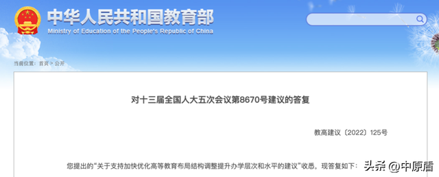 答复中提到:积极支持河南省设立高等学校、支持河南高校改善办学条件和提升办学水平、支持河南高校人才队伍建设。