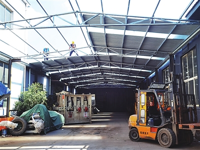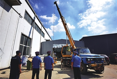 9月26日上午,记者在瑞金路徐家工业园一家企业大院内看见,李沧区综合行政执法局楼山中队的执法人员调来了一辆吊车,将戴着安全帽、系着安全绳的工人们送到一处违建的屋顶,开始拆除顶层瓦片。