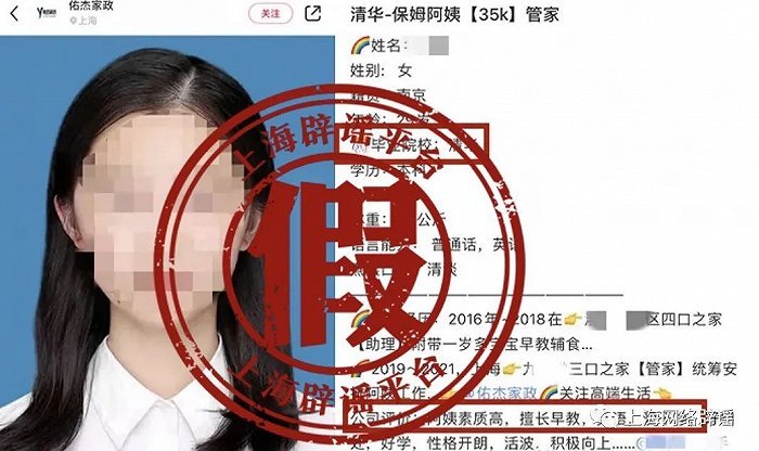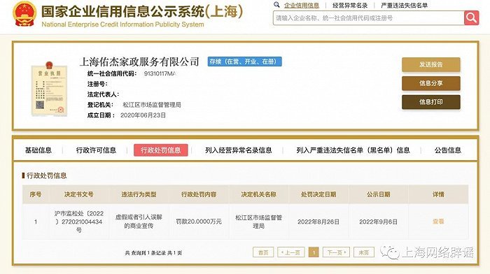 央视网消息: “上海网络辟谣”微信公众号9月27日消息,曾引发公众关注的“清华-保姆阿姨【35k】管家”服务信息其实是家政公司为了吸引眼球而编造的。近期,上海松江区市场监督管理局公示一则行政处罚信息称,该家政公司上海佑杰家政服务有限公司以“清华-保姆阿姨【35k】管家”为标题撰写的商业宣传为虚假内容,依据《中华人民共和国反不正当竞争法(2018)》第二十条第一款处罚20万元。