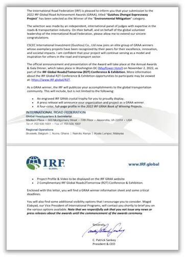 全球道路成就奖被誉为全球道路行业的“诺贝尔奖”,由全球道路联合会(IRF Global)于2000年设立,代表着全球道路行业技术发展和管理水平的最高成就,是国际道路行业内最有声望的荣誉之一,包含环境、设计、研发等12个单项奖,每个单项奖全球仅授予一个项目。这是中国建筑在国内首次、也是贵州首次获此国际性殊荣,对推进交通强国建设、中国基建走向世界具有重要意义。国际道路联合会副主席,中国公路学会党委副书记、副理事长兼秘书长刘文杰表示:中国建筑国际投资建设的贵州正习高速公路获得了国际路联授予的全球道路成就奖,是一次重要突破,是近年来我国交通基础设施理念创新、科技创新、管理创新的成功范例。本次获奖,充分展示了中国建筑在国际交通建设领域的品牌实力,是中国建筑在环境保护领域的重大突破,为全球交通建设项目树立了值得借鉴的可持续发展范本。