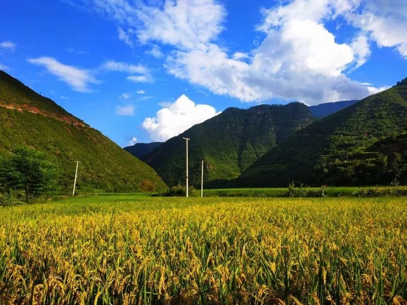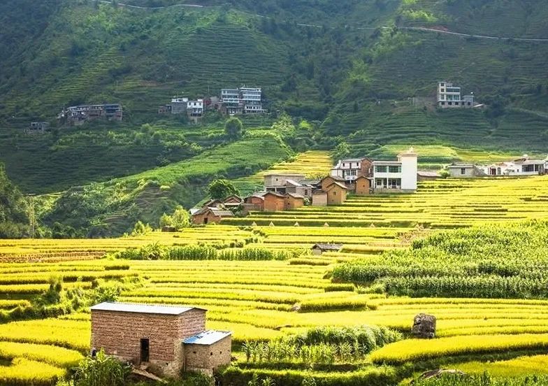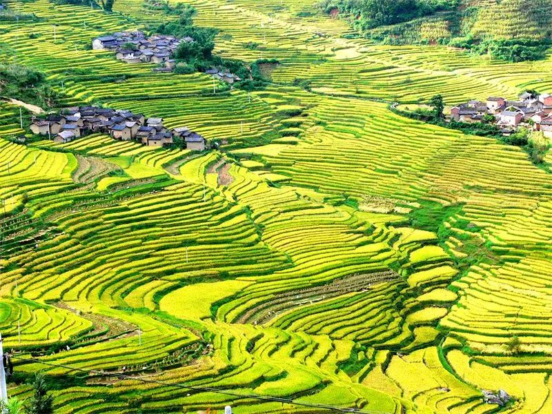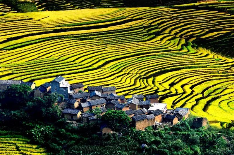 秋天,层层叠叠、蜿蜒盘旋的鄂嘉梯田一片金黄,似调色盘镶嵌在大地上,以惊艳的方式装点着农舍、绿水和青山,犹如浑然天成的水彩画,甚为养眼,令人心醉。