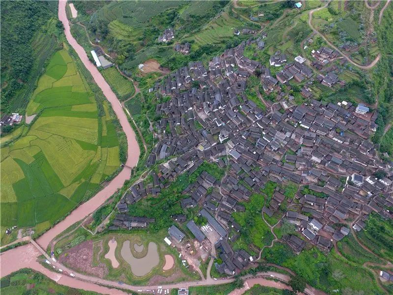 古村依山就势,处于河谷地带,从山顶俯瞰全貌,落差造就了惊艳的全景,有一种豁然开朗之感。远眺全村,屋舍古朴,让人难辨时光;村旁有稻田、果林、青山绿水,拥有世外桃源般令人心向往之的悠然。