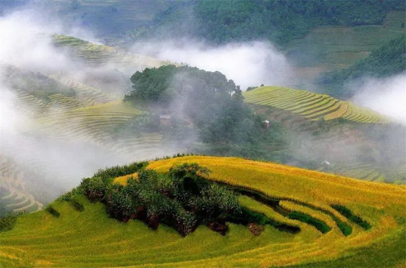 清晨,薄雾弥漫在梯田上空,远处的农舍和青山都带着一丝朦胧。待雾气消散,红日东升,梯田在阳光照射下闪耀着金色的光辉,整片梯田瞬间化为浑然天成的大地艺术品,用鲜明的色彩装点着鄂嘉的乡间田野。