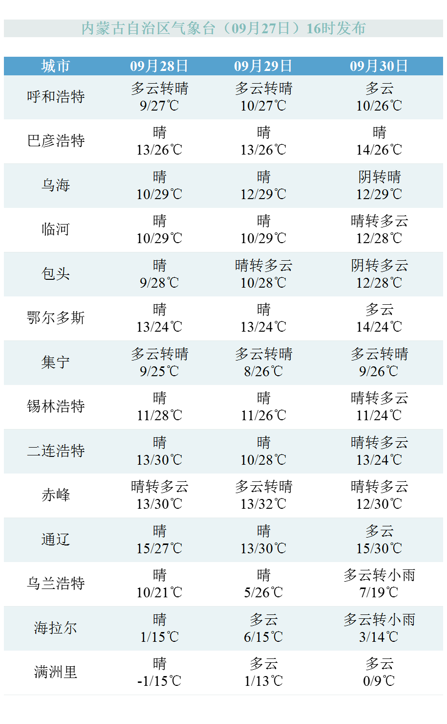 我区中部偏东、东部大部地区多云间晴,锡林郭勒盟东北部、赤峰市北部偏北、通辽市北部、兴安盟、呼伦贝尔市大部有小雨或雨夹雪,其余地区晴间多云;中部偏东地区4、5级短时6、7级偏西风;中部偏西、东北部偏东地区气温下降4到6度。