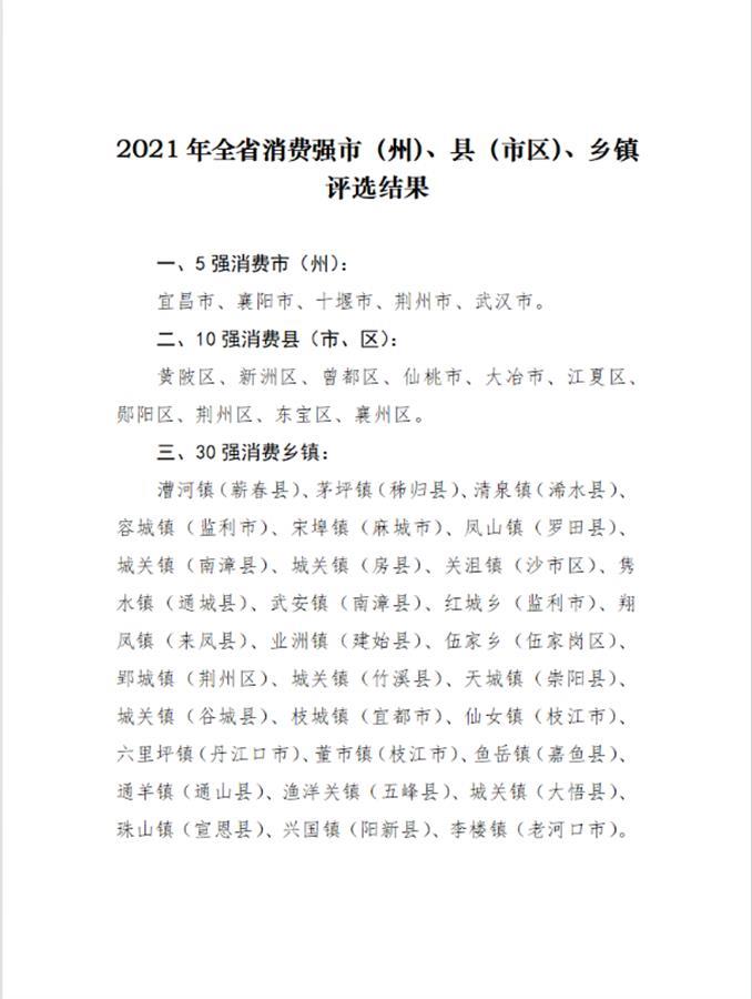 湖北日报讯(记者李朝霞、通讯员沈商轩) 9月27日从省商务厅获悉,我省评选宜昌、襄阳、十堰、荆州、武汉为2021年全省5强消费市(州),黄陂区、仙桃市、襄州区等地区为10强消费县(市、区),漕河镇(蕲春县)、茅坪镇(秭归县)、清泉镇(浠水县)等乡镇为30强消费乡镇。