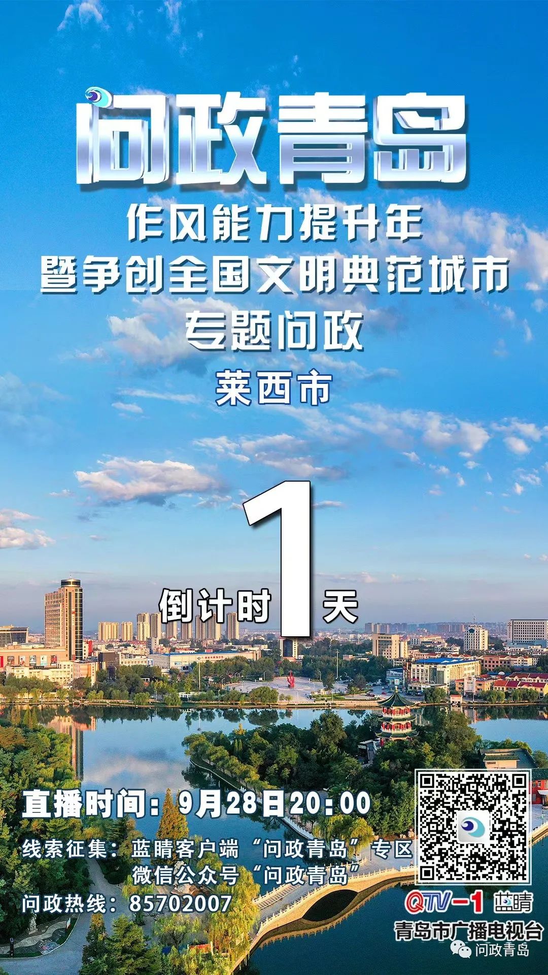 明晚8点,《问政青岛》作风能力提升年暨争创全国文明典范城市专题问政,将问政莱西市,欢迎您通过QTV-1、蓝睛APP、蓝睛新闻视频号观看节目直播。