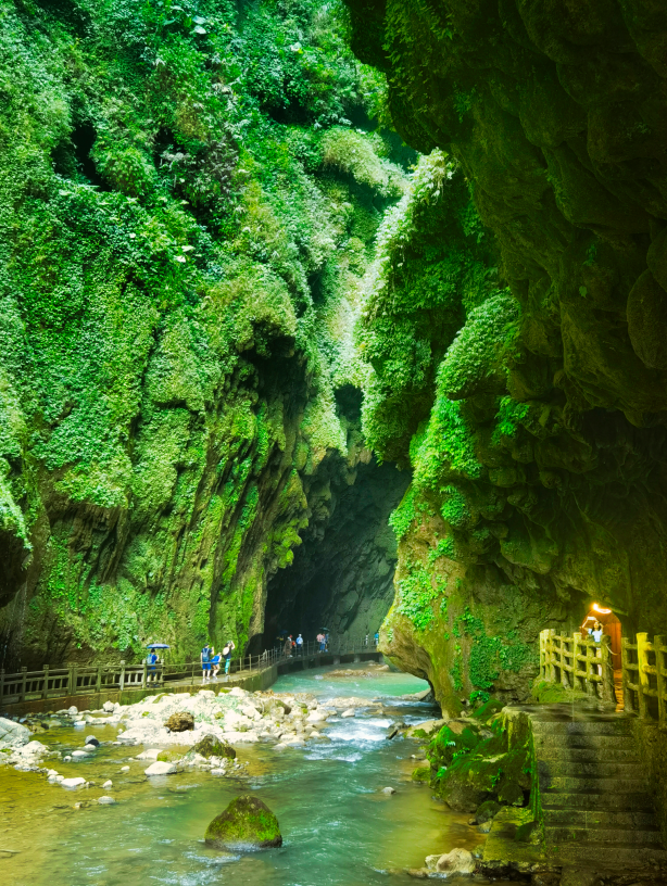 幽深旷野的峡谷风光、奇峰林立的溶洞奇观、气势磅礴的谷底河流、凌空飞泻的壮美瀑布,还有神秘莫测的地下暗河……被誉为“一水穿三峡贯三洞”。