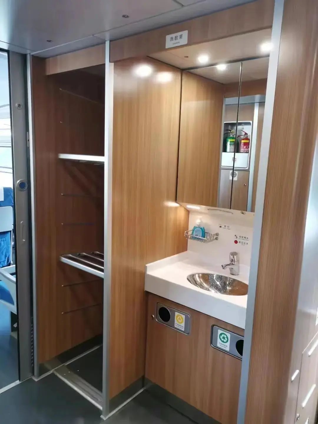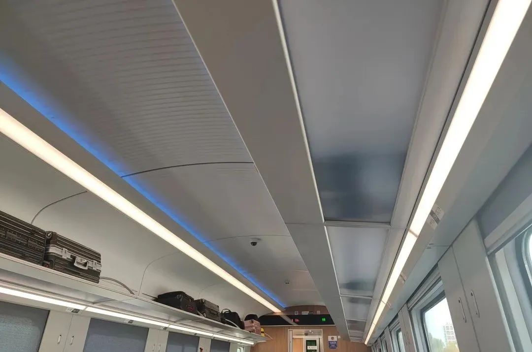 鼓型动车组提高了行李架位置,增大了旅客空间的舒适度,且由于车体顶部向外扩出,行李架的纵深和容积将更大,可以置放更多行李。同时,列车增加了4个大件行李存放处,方便了携带较大行李的旅客进行存放。