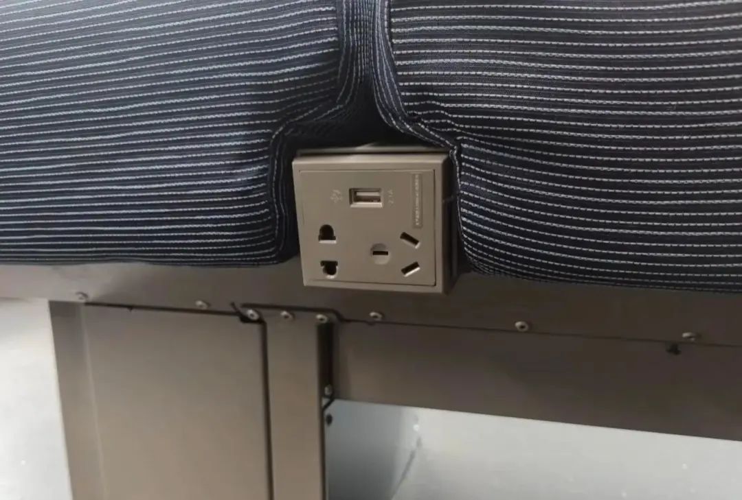 鼓型动集动车组增加了电源插座数量,由过去的三座一插改为三座两插,每排增加一个充电插座,并将插座位置由原先的座椅下方调整至座椅扶手下方,让旅客使用起来更为方便、顺手。