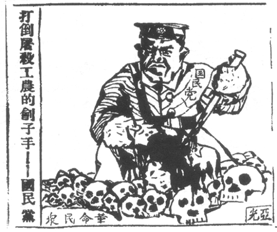 1933年7月14日,《红色中华》报第1版刊发了署名潘汉年撰写题为《反对国民党法西斯的白色恐怖》的社论,揭露国民党暗杀民权保障大同盟发起人杨杏佛,封闭御侮救国大同盟,逮捕进步会员数百名的罪行。号召“中国的一切工农劳苦群众,只有加紧团结起来,开展革命的民族战争,以血腥的斗争来冲破国民党法西斯蒂的白色恐怖!”在论论中配有一幅黄亚光创作的《打倒屠杀工农的刽子手——国民党》漫画。画中一名凶神恶煞的国民党军阀举着滴血的屠刀,踩着一堆革命民众的骷髅,揭露了国民党与人民为敌的反动本质。