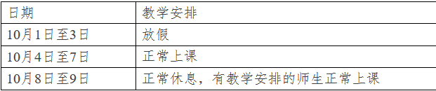 10月1日至3日放假。10月4日至7日正常上课。10月8日至9日正常休息,有教学安排的师生正常上课。