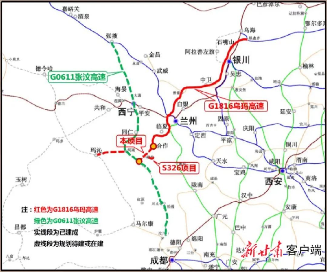 G1816乌海至玛沁高速公路合作至赛尔龙(甘青界)段项目共包含两个子项目——G1816乌海至玛沁高速公路合作至赛尔龙(甘青界)段,路线全长105.841Km,主线采用双向四车道高速公路标准建设,设计速度100公里/小时;S326卓尼至碌曲公路双岔至碌曲段工程,建设里程24.912Km,采用二级公路技术标准建设,设计速度80公里/小时。G1816乌玛高速公路合作至赛尔龙(甘青界)段不仅是甘肃、青海两省之间的重要通道,也是四川等西南地区通往西北地区的一条快速通道,建成后将连接西成铁路、夏河机场,实现甘、青、川省际快速通道互联互通。(新甘肃·每日甘肃网见习记者马腾飞)