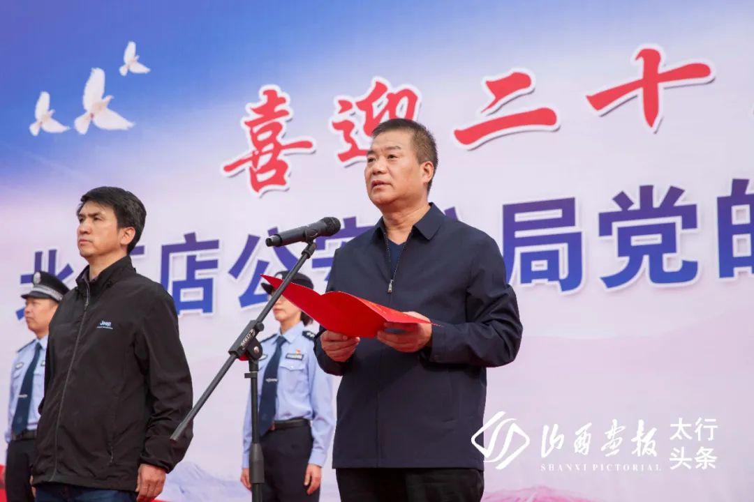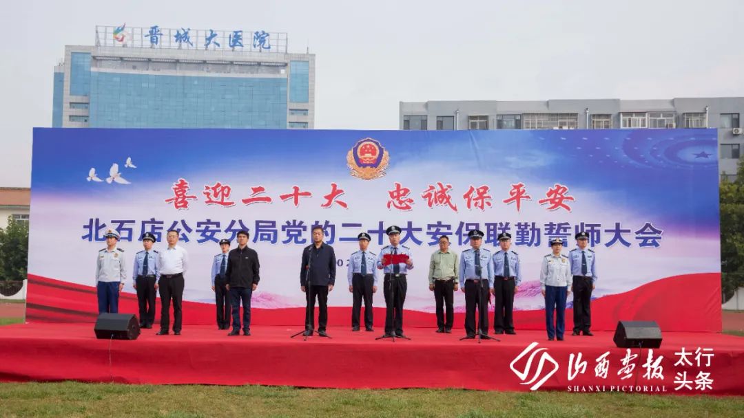 山西画报晋城讯(记者 李鹏飞)9月27日上午,晋城市公安局北石店分局在辖区机关体育场隆重举行“喜迎二十大 忠诚保平安”安保维稳联勤誓师大会,晋能控股装备制造集团党委副书记、董事、工会主席潘建锋,北石店分局党委书记、局长杨广鹏出席并讲话,活动由北石店分局党委副书记、政委李渊主持。