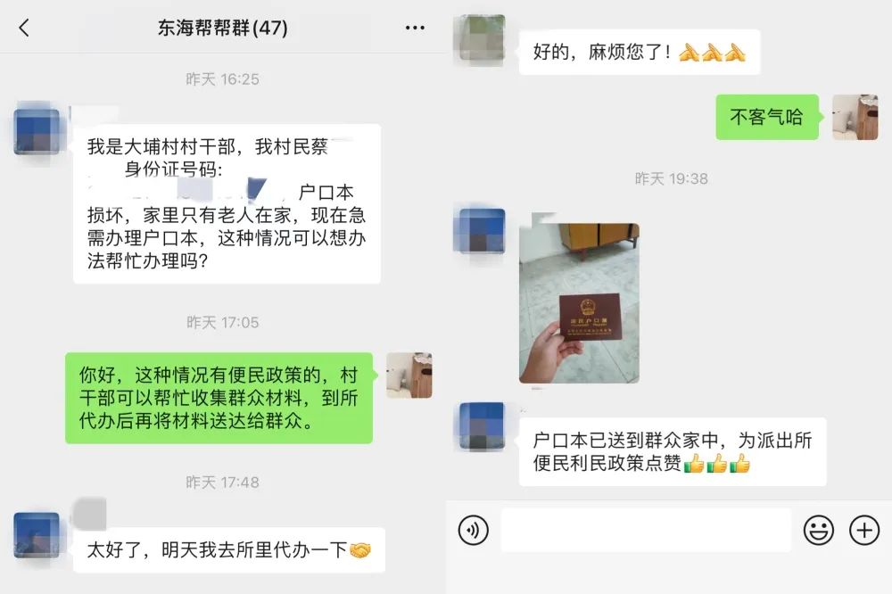 东海镇位于沿海地区,留守在东海镇的多为老年群体,常因出行不便等原因无法到派出所办证。针对此情况,东海派出所联合分局户政科建立“东海帮帮群”微信群,整合户政科业务指导员、窗口办事人员、社区民警、网格员及村居干部,为辖区群众提供24小时在线咨询,对因事无法到场办理业务人员、老弱病残孕等特殊群体提供“帮代办”服务。