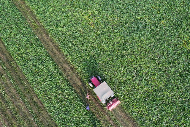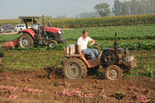 临近11时许,悬挂陕西号牌的轻型厢式货车等不及,从路上开到了地头。此时,王向超的小型拖拉机仍在地里转圈作业,犁过之处,深埋地下的红薯一行行得见天日。而王向克驾驶的大型“东方红”拖拉机的杀秧工作,虽然告一段落,但机停人未歇。