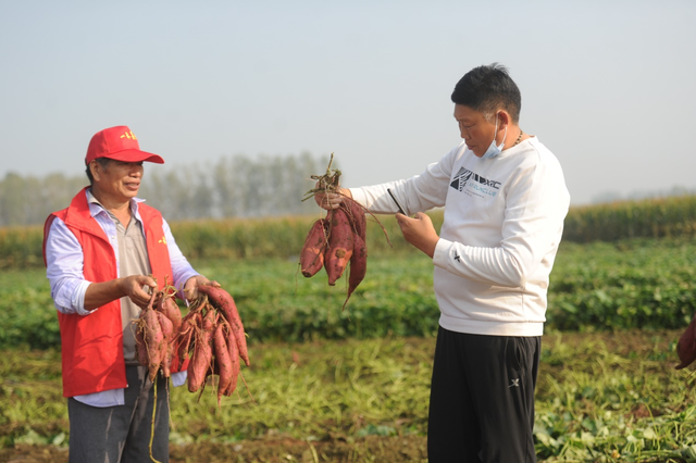 在李正平介绍红薯行情的同时,孟武正、王永朝都在地里穿梭,举着手机,用视频连线各自的合作方,线上谈价。