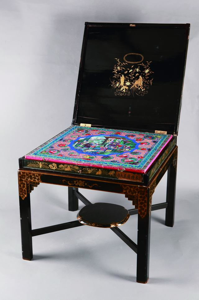 清代黑红漆描金人物纹披肩盒、盒架 (广州博物馆供图)