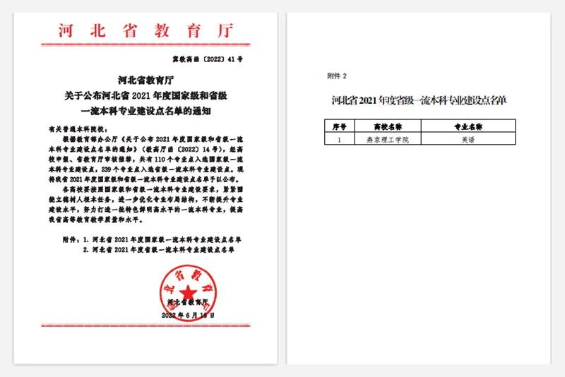根据《河北省教育厅关于公布河北省2021年度国家级和省级一流本科专业建设点名单的通知》(冀高教函〔2022〕41号)文件,燕京理工学院英语专业正式获批成为省级一流专业。至此,与2019和2021年获批的法学、会计学、物联网工程、物流管理、制药工程、产品设计、自动化、审计学、视觉传达设计9个本科专业,燕京理工学院已有10个省级一流本科专业建设点。